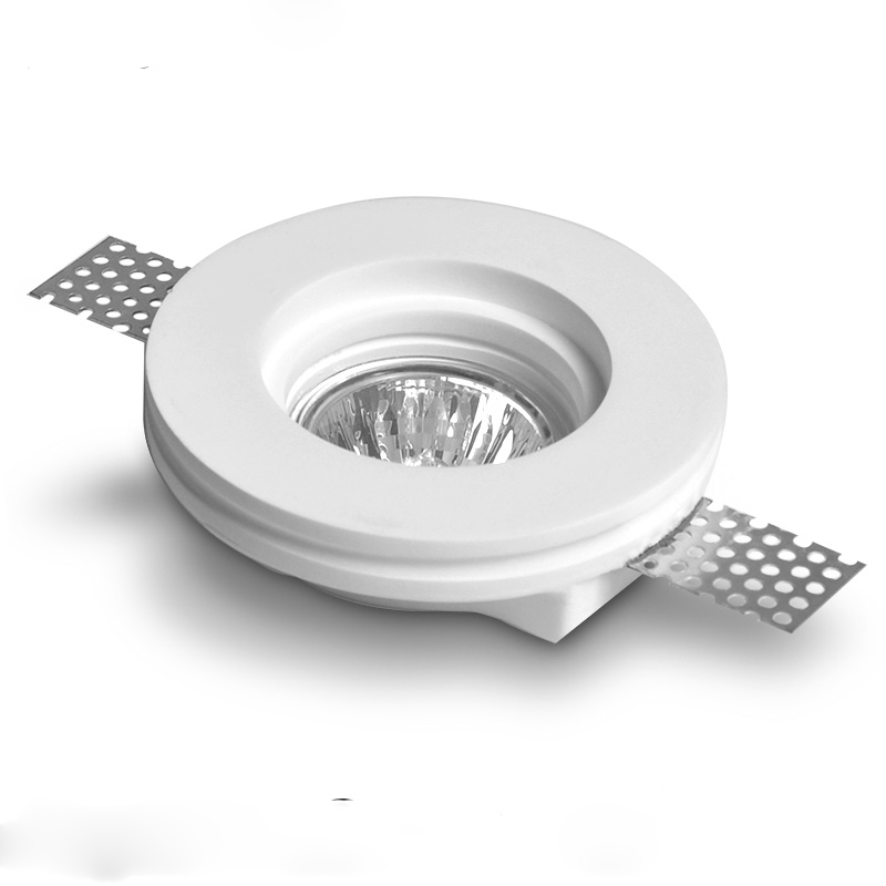 Projector cerâmico de tecto para lâmpadas MR16 ou GU10.Este projector deve ser encastrado em gesso cartonado e betumado após a construção da parede ou tecto para ficar à face com os mesmos, (sem aro á vista)